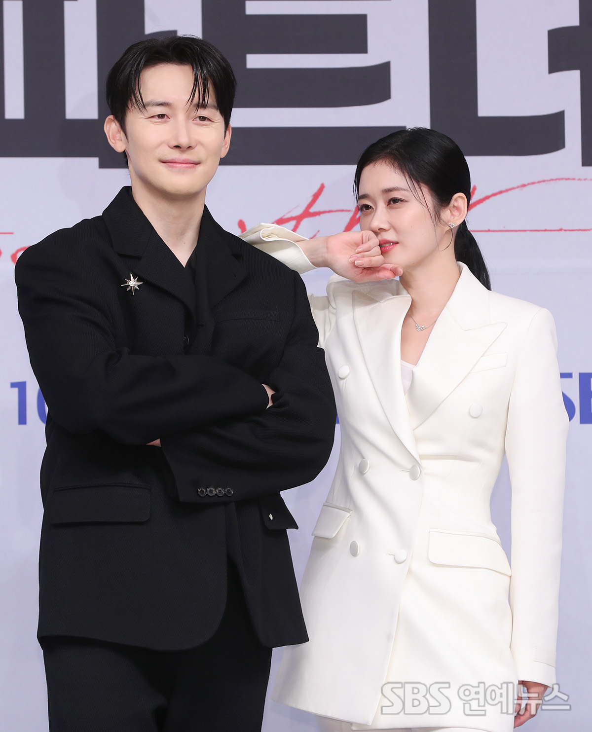 Actors Kim Jun Han (left) and Jang Nara hit the press line at SBS in Seoul on July 10, posing together at the press conference for the new drama 'Good Partner.'