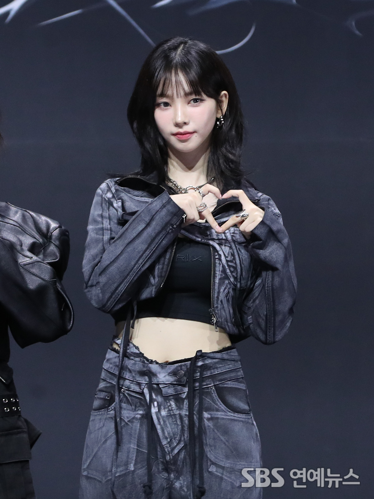 KARINA of aespa hit the press line at Blue Square in Seoul’s Yongsan district during a May 27, 2024 media showcase celebrating the group’s first studio album, “Armageddon.” She flashed a bright heart pose for photographers.