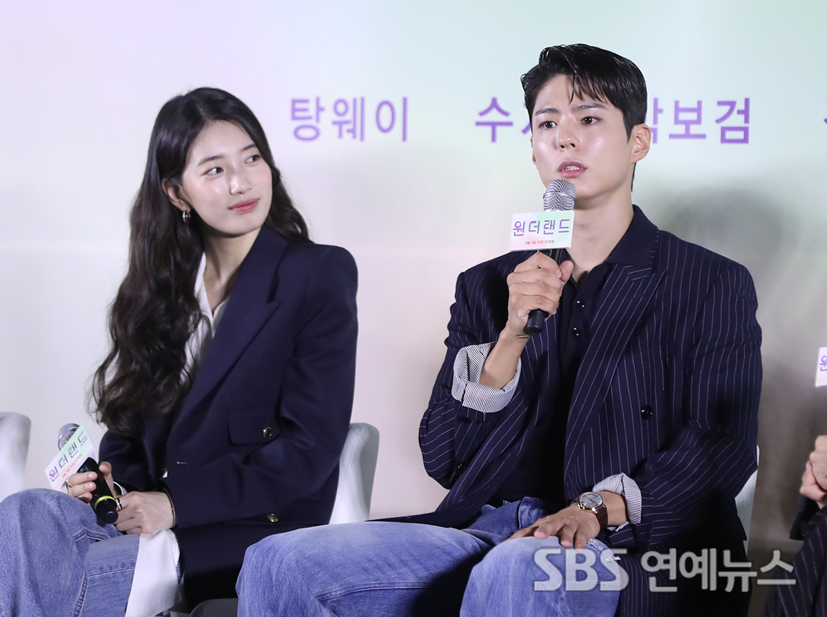 Bae Suzy and PARK BO-GUM stepped out in coordinated looks at the WONDERLAND press conference, held at CGV Yongsan I'Park Mall in Seoul on the morning of May 9, chatting onstage and posing for photos.