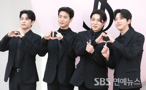 DAY6 hit a beauty brand photocall in Seoul’s Seongsu-dong on the afternoon of April 24, striking playful poses and flashing heart hands for the cameras.