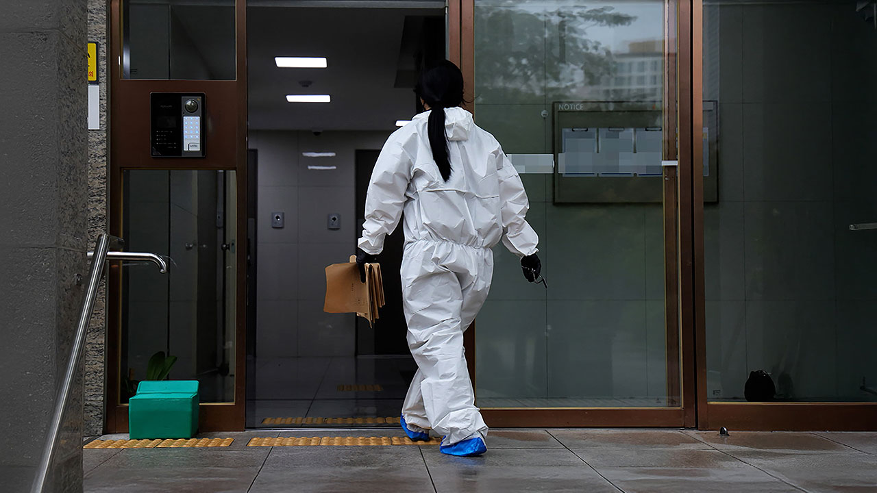 아파트 문 앞에 경찰 통제선이 처져 있습니다.