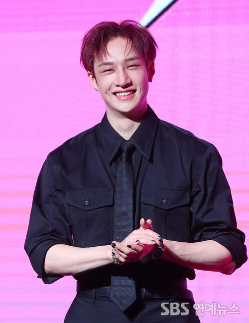 BANG CHAN of Stray Kids hit the photo line at a press conference celebrating the group’s mini-album “ROCK-STAR,” held at Conrad Seoul in Yeongdeungpo, Seoul, on the morning of Nov. 10, 2023. The group’s leader flashed his trademark smile as he posed for cameras.