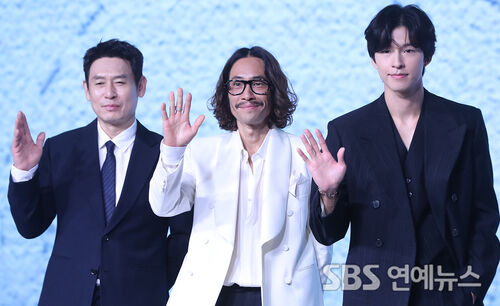 From left, Sul KyungGu, Ryoo Seung-bum and Hong Kyung attend the production presentation for Netflix’s film 'Good News' at JW Marriott Dongdaemun Square Seoul in Jongno-gu on the morning of Oct. 14, stepping in for a photo call.