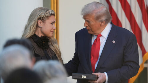 ▲ 도널드 트럼프 미국 대통령이 14일(현지시간) 지난달 암살된 우파 청년활동가 찰리 커크에게 사후 수여하는 메달을 커크의 아내 에리카에 전달하고 있다.