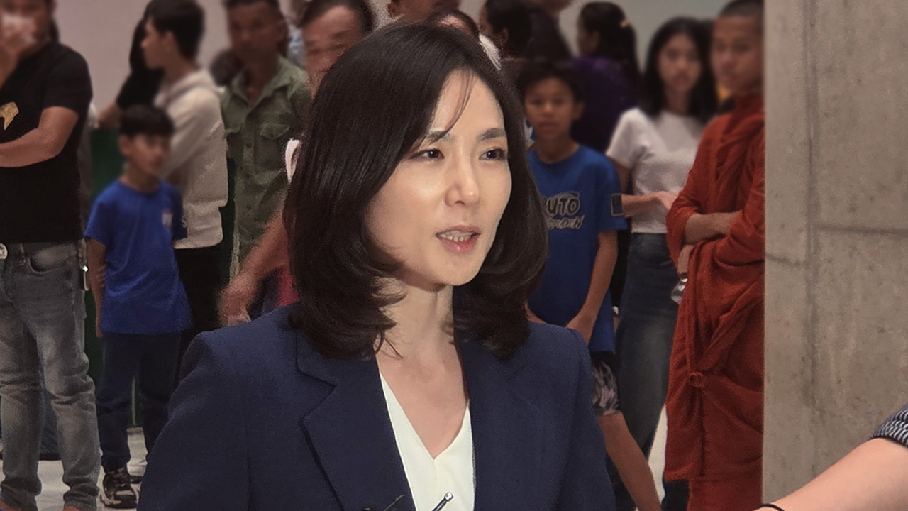 ▲ 15일(현지시간) 오후 수도 프놈펜 인근 테초 국제공항에서 정부 합동대응팀 단장인 김진아 외교부 2차관이 취재진 질문에 답변하고 있다.