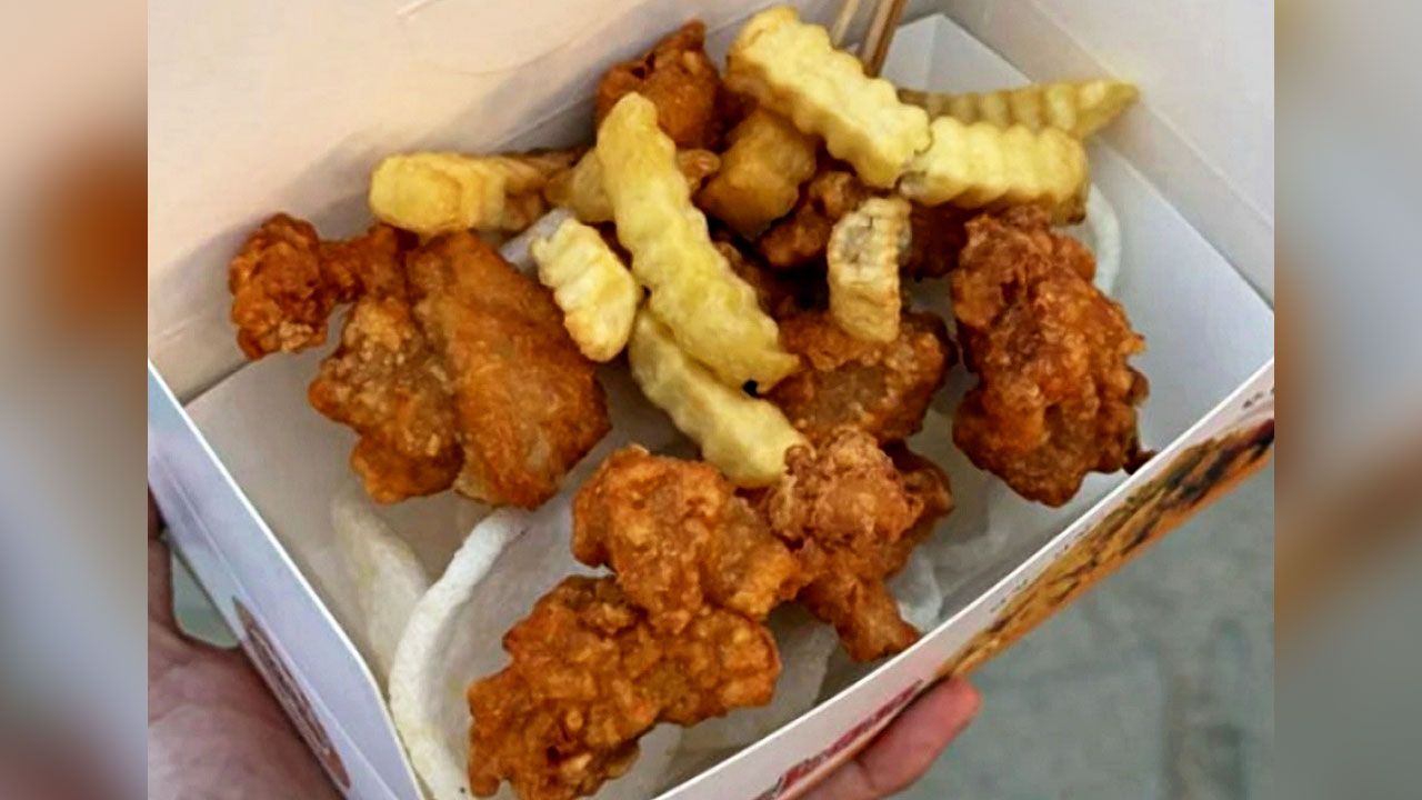 이 사진 속에는 손바닥만 한 한 상자에 식은 닭강정 몇 조각과 감자튀김, 새우칩이 전부였습니다.