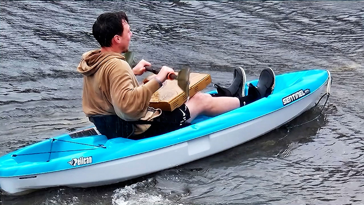 이런 길에서 차를 타고 배달을 다닐 순 없으니 대신 카약을 타고 나선 겁니다.