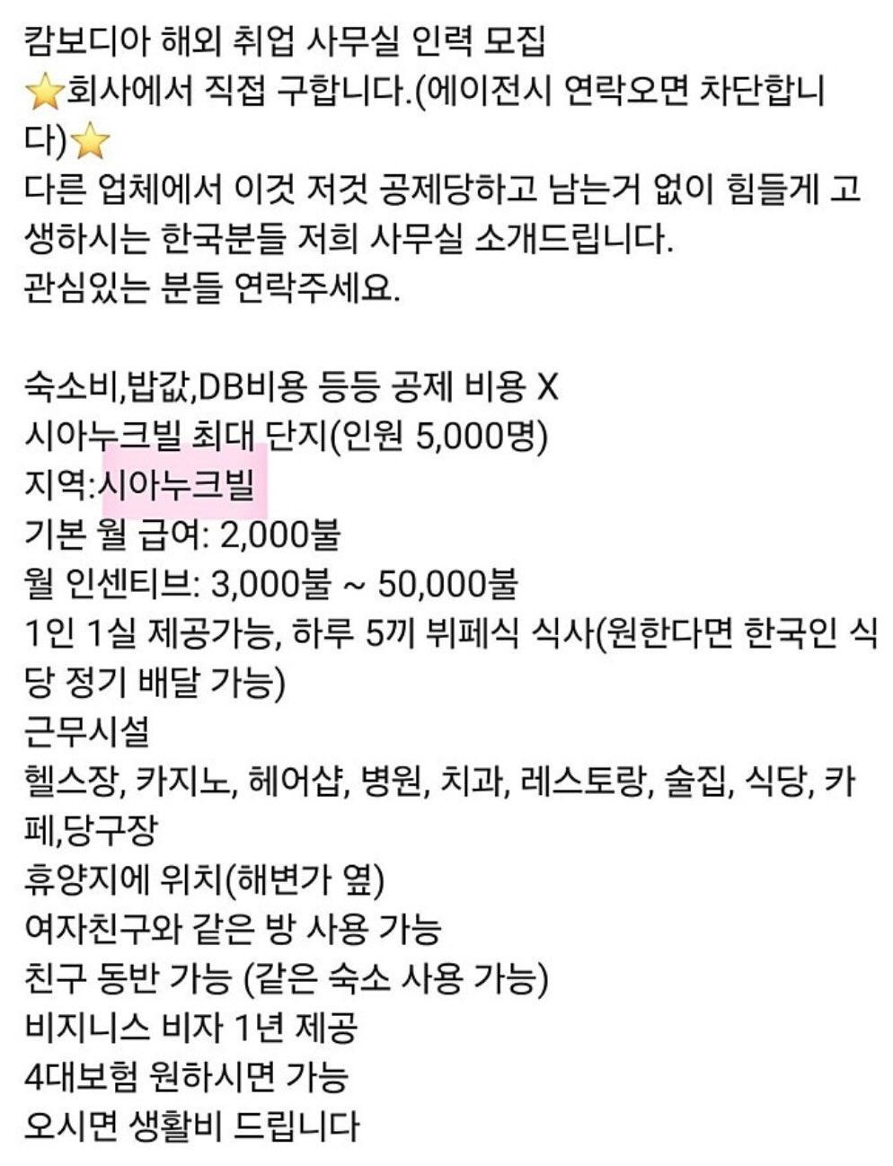 한 작성자는 "캄보디아에서 가장 탄탄하고 안전한 회사"라며 "다들 빚이 많았고 어렵게 결정을 내려오셨지만 지금은 빚도 정리하고 돈 모아가며 재밌게 놀고 일할 땐 일하며 지내고 있다"고 홍보했습니다.