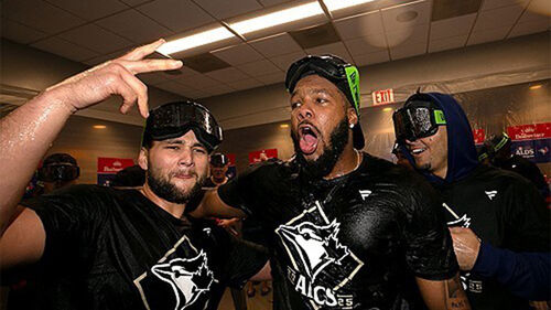 ▲ 토론토가 21일 월드시리즈 진출을 확정한 뒤 라커에서 자축 파티를 열어 보 비솃(왼쪽)과 블라디미르 게레로 주니어가 즐기고 있다.