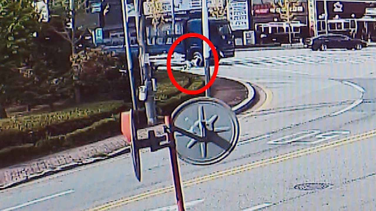 우회전하던 9.5톤 군용 트럭이 멈추지 못하고 그대로 지나갑니다.