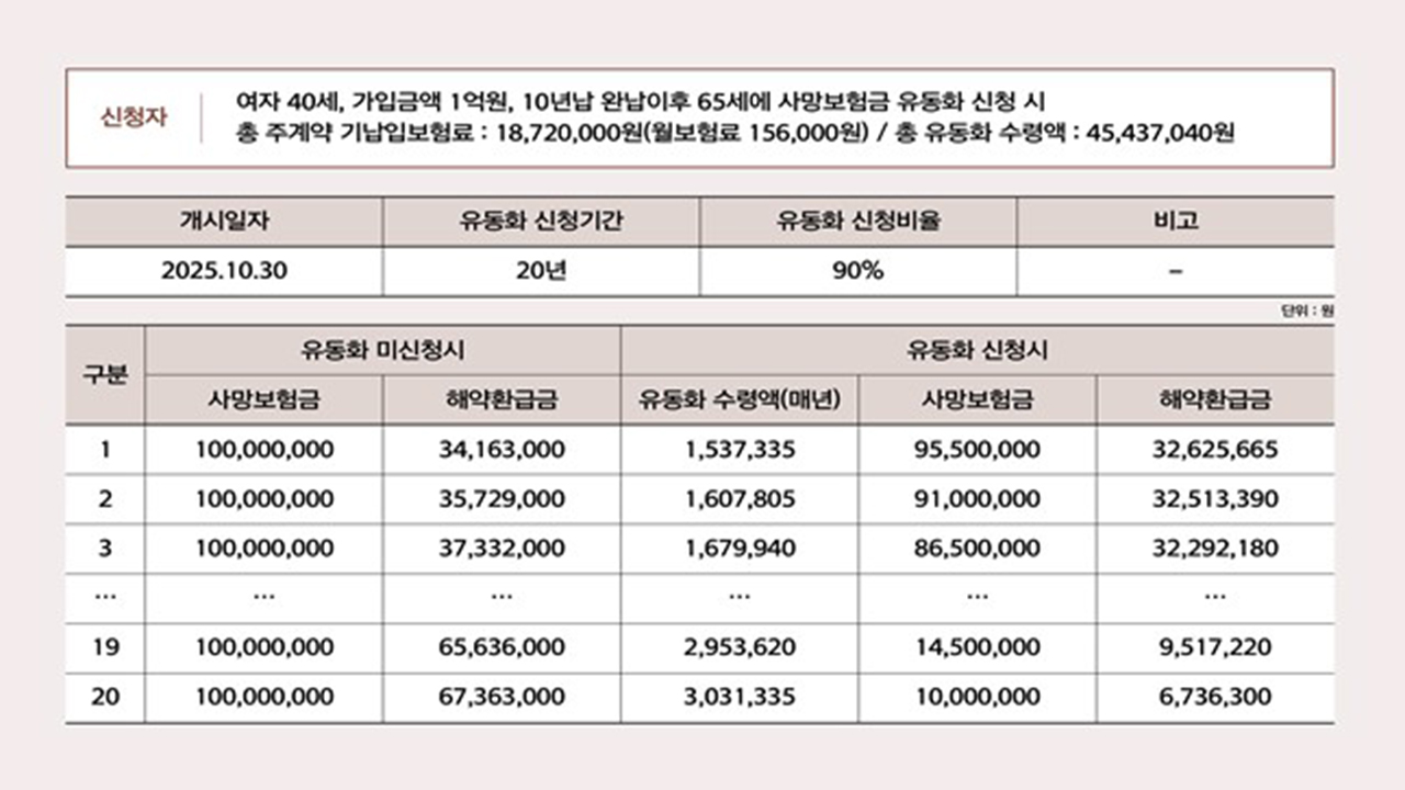 보험사에서는 사망보험금 유동화 비교 안내 시스템을 통해 유동화 신청 전 소비자가 선택한 유동화 비율과 기간에 따른 지급 금액 비교결과표도 제공합니다.