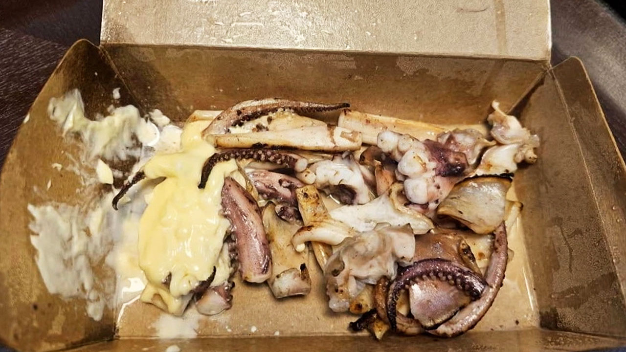 사진 보면 오징어 다리 몇 개와 부스러기 수준의 몸통 조각만 남아 있는 걸 볼 수 있습니다.