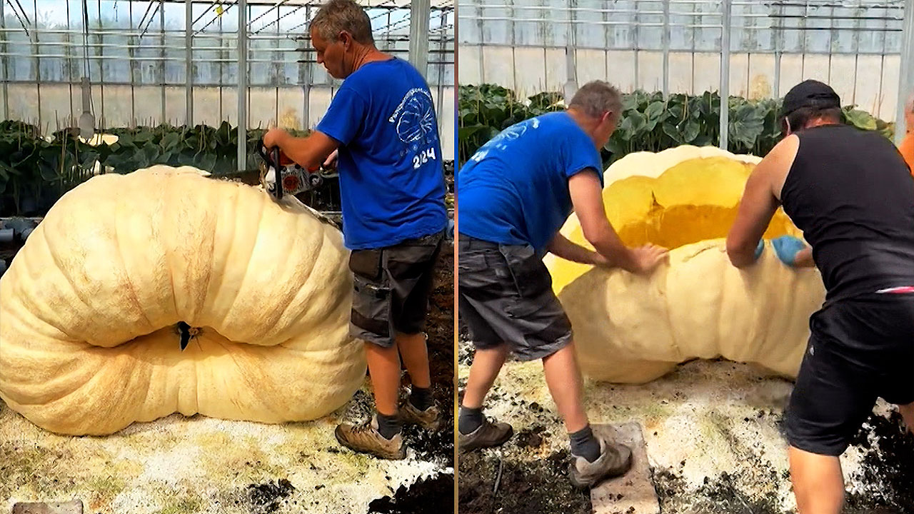 겉껍질이 얼마나 두꺼운지 톱날을 한참 대고 있어야 겨우 벌어지기 시작하는데, 무려 1톤도 넘는 초대형 호박을 가르는 순간입니다.