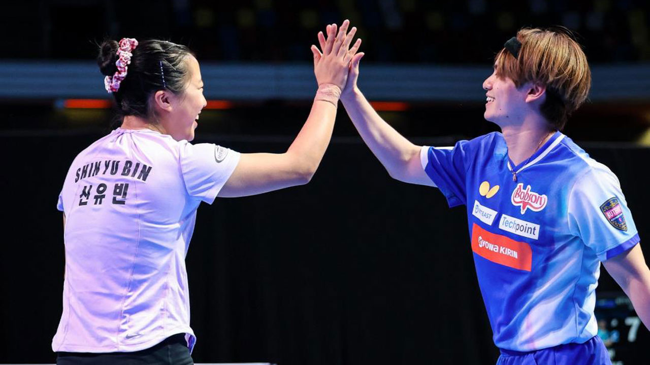 ▲ WTT 런던 대회 혼복에 일본 우다와 출전한 신유빈(왼쪽)