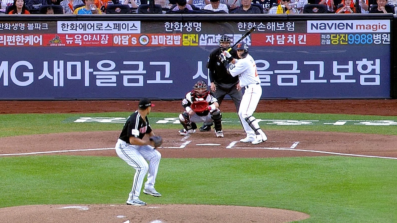 1회 한화 문현빈의 가운데 담장을 때릴 듯한 타구를 펜스 앞에서 점프하면서 잡아내 LG 팬들을 열광시켰습니다.