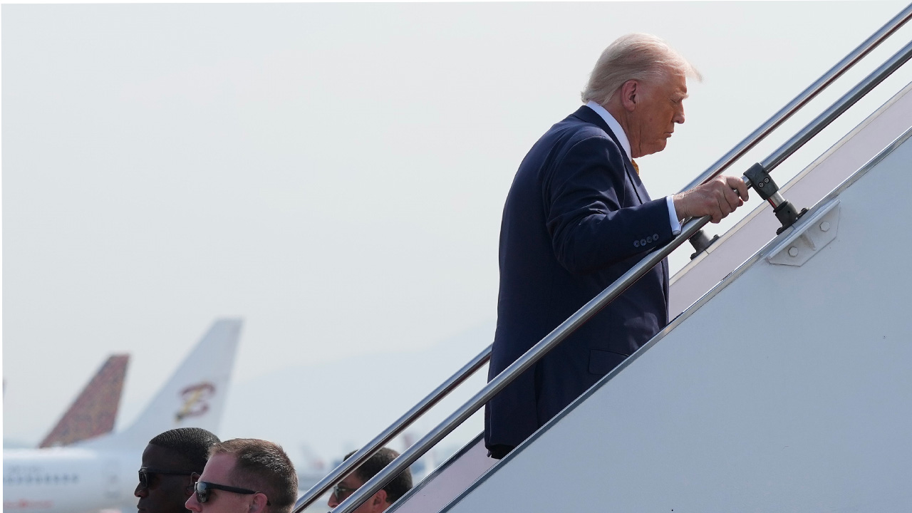 ▲도널드 트럼프 미국 대통령이 27일(현지시간) 말레이시아 쿠알라룸푸르 국제공항에서 일본 도쿄로 향하는 대통령 전용기 에어포스원에 탑승하고 있다.