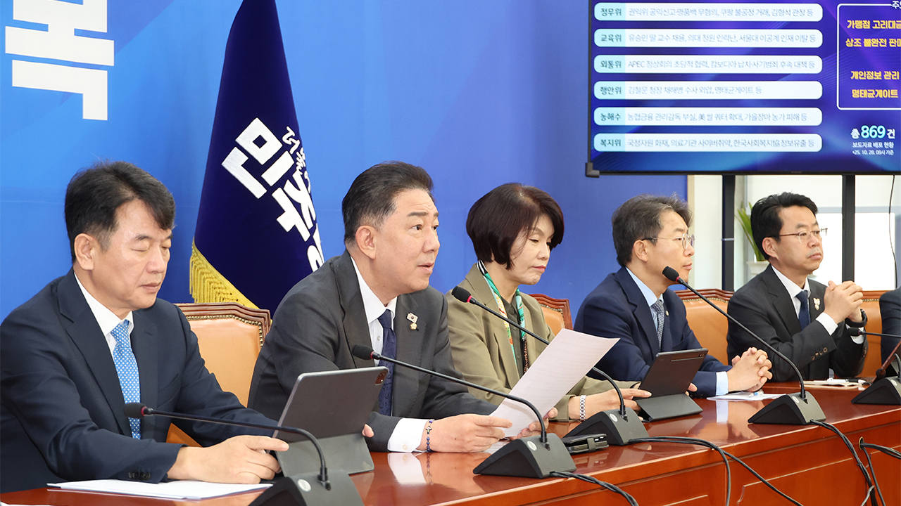 허영 원내정책수석은 "22대 국회 들어 기후에너지환경노동위원회의 쿠팡 근로 조건 개선 청문회와 과학기술정보방송통신위원회의 이동통신 3사 해킹 청문회가 열렸지만, 기업은 책임을 회피했고 제도 개선은 제자리"라며 이를 바로잡아야 한다고 설명했습니다.
