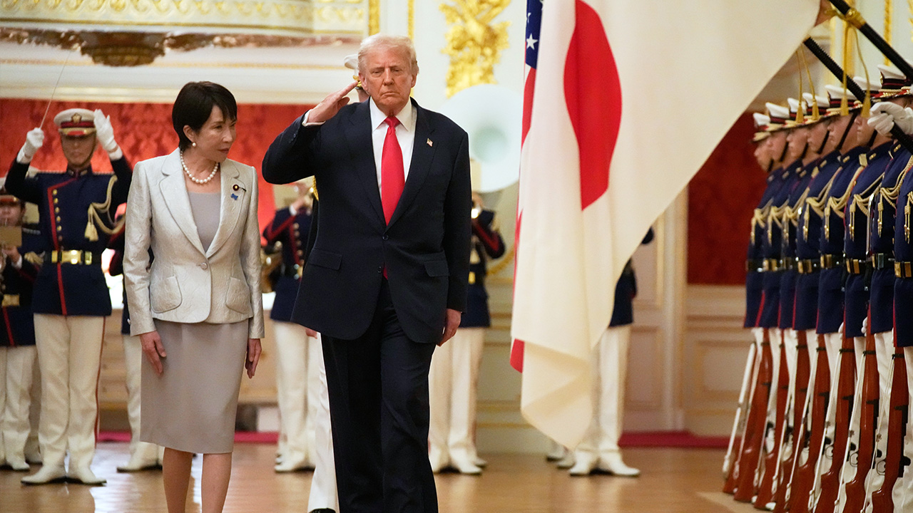 ▲ 도널드 트럼프(가운데) 미국 대통령이 28일 일본 도쿄 아카사카궁에 도착해 다카이치 사나에 일본 총리와 함께 자위대 의장대를 사열하고 있다.