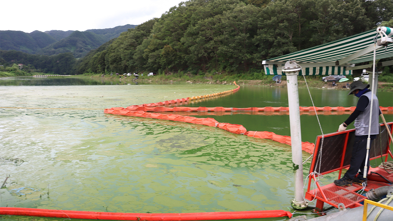 ▲ 8월 한국수자원공사 대청댐지사 관계자가 충북 옥천의 서화천 하류에 2중 차단막으로 가둬놓은 녹조 찌꺼기를 제거하고 있다.