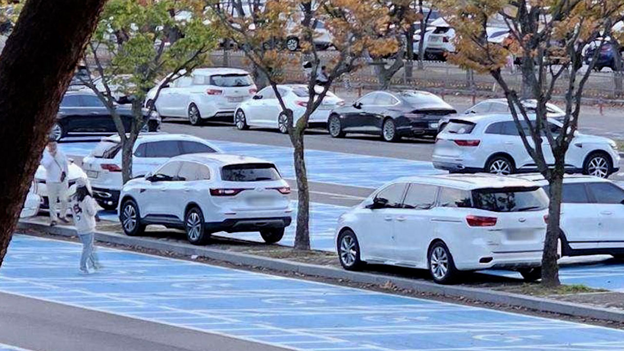 설마 인도에 주차를 했을까 싶으시죠? 실제 놀이공원 주차장에서 차들이 줄줄이 인도 위에 주차된 모습이 포착돼 공분을 사고 있습니다.