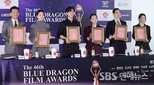 From left, actors Hwang Jung-min, Kim Goeun, Jung Hae-in, Lee Sang Hee, Noh Sang Hyun, and Park Ju-hyun pose for a photocall at the 46th Blue Dragon Film Awards Handprint Ceremony at CGV Yeouido in Seoul on Oct. 29.