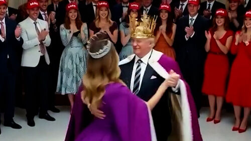 금관을 쓴 트럼프 대통령, 멜라니아 여사와 춤을 추는 모습. AI와 합성된 영상입니다.
