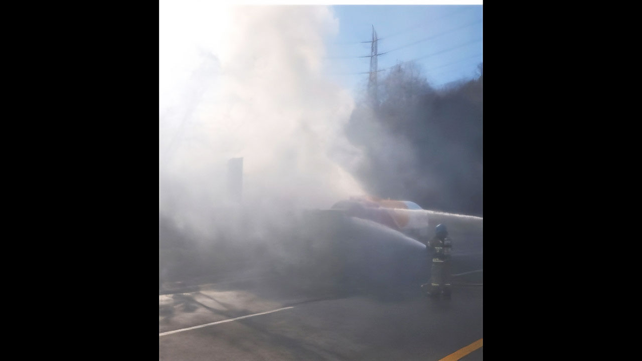 오늘(17일) 낮 1시 40분쯤 경기 양주시 광적면 56번 국도 갈곡터널 양주 방향 입구 인근에서 LPG 탱크로리에 불이 났습니다.