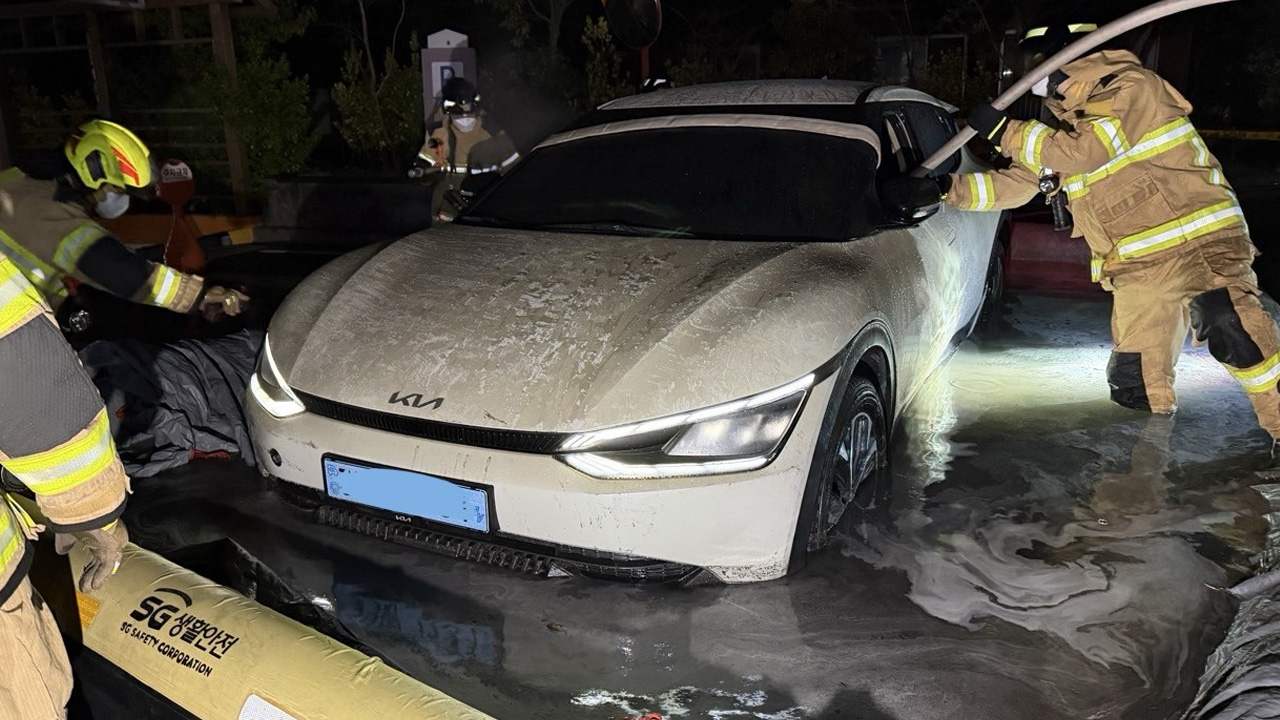 ▲ 19일 새벽 제주 전기차 화재 진압하는 소방대원들