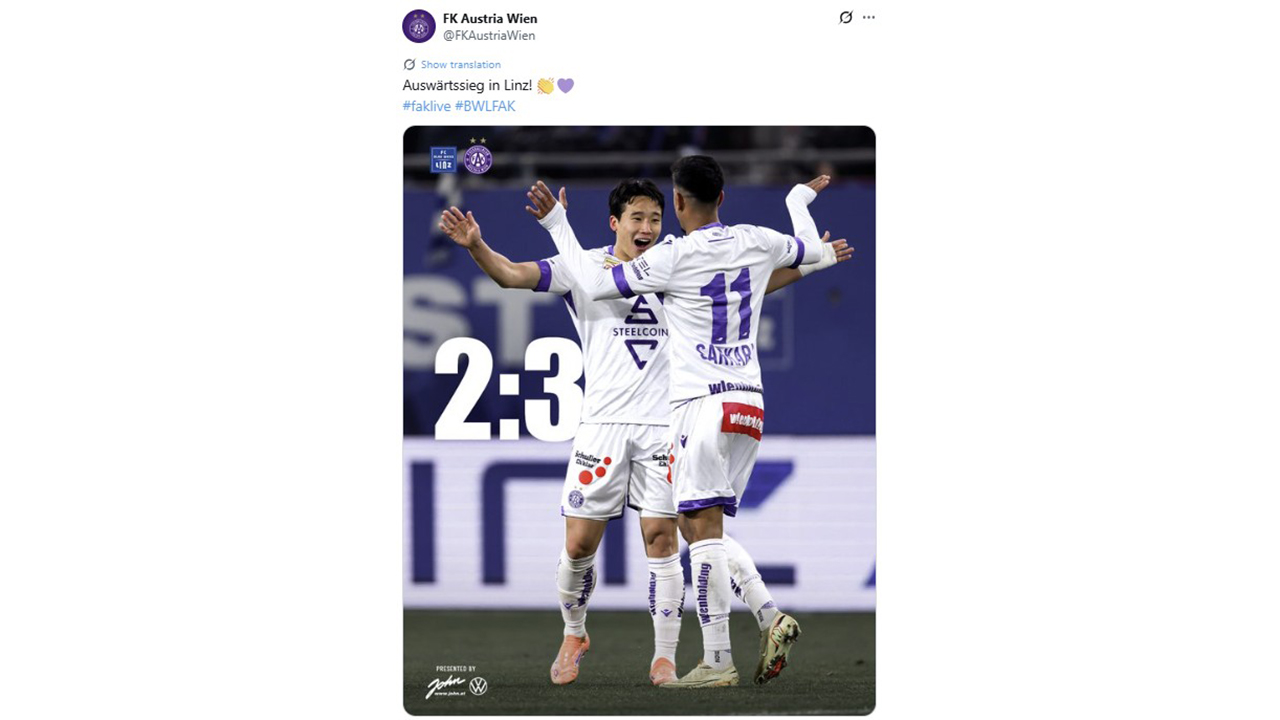 아우스트리아 빈은 3-2로 이겨 최근 리그 2연승으로 5위(승점 22)에 올랐습니다.