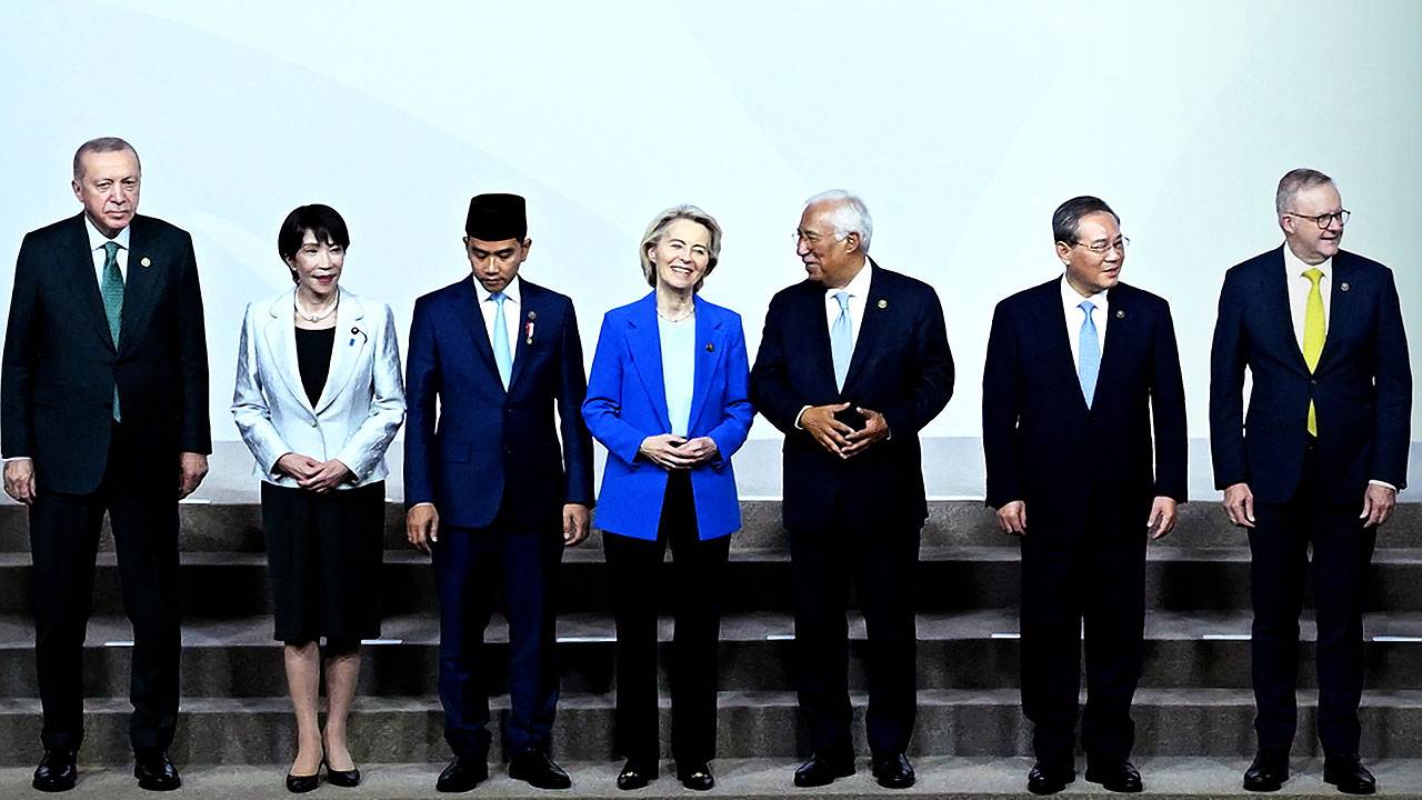 G20 정상들의 단체 사진 촬영 현장, 다카이치 일본 총리가 환하게 웃으며 에르도안 튀르키예 대통령과 악수합니다.
