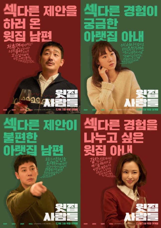 '윗집 사람들' 홍보사는 24일 오전 배우들의 캐릭터를 엿볼 수 있는 포스터 4종을 공개했다. 먼저 '섹다른' 제안을 하러 온 윗집 남편 김선생(하정우)은 와인잔을 든 채 여유로운 모습을 보여주고 있는 반면, 굉장히 파격적인 대사를 보여주고 있어 눈길을 사로잡는다. 이어 '섹다른' 경험이 궁금한 아랫집 아내 정아(공효진)는 순진한 표정을 하고 있지만, 윗집 부부의 이색적인 제안에 호기심을 남발하고 있다.