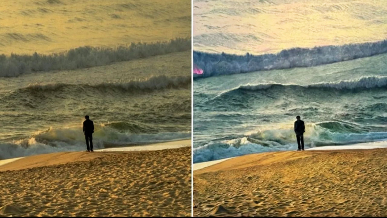 두 작품을 비교해 보면 모래사장에 서 있는 인물의 위치와 비율, 심지어 파도 라인이 끊기는 지점과 뒤쪽의 큰 파도의 능선까지 거의 동일합니다.