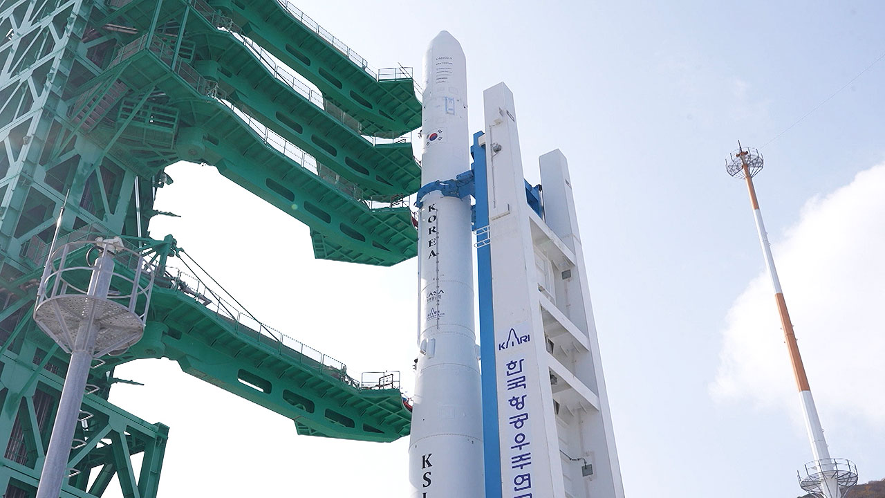 ▲ 한국형발사체 누리호가 25일 전남 고흥 나로우주센터에서 4차 발사를 위한 기립작업이 진행되고 있다.