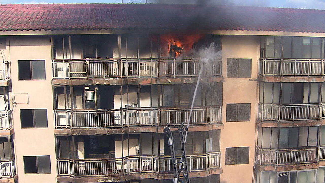 아파트에서 시커먼 연기와 함께 화염이 솟구칩니다.