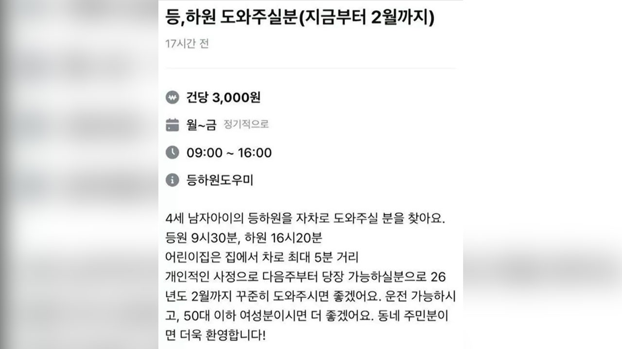 작성자는 4살 아동의 등하원을 자차로 맡아달라며 50대 이하 여성 환영이라는 조건까지 달았는데요.