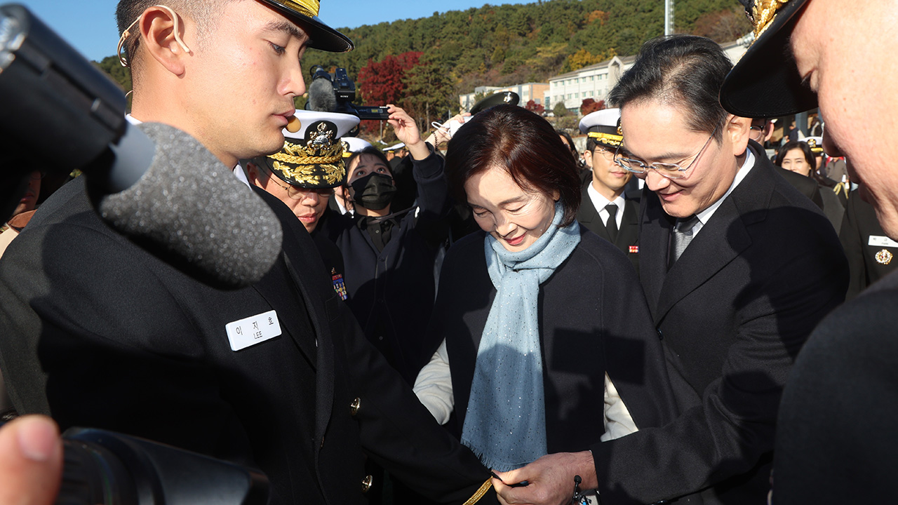 ▲ ▲ 28일 해군사관학교 연병장에서 열린 제139기 해군·해병대 사관후보생 수료 및 임관식에서 이재용 삼성전자 회장과 홍라희 리움미술관 명예관장이 이지호 신임 소위에게 계급장을 달아주고 있다.
