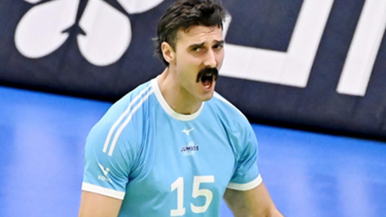 ▲ 대한항공 외국인 공격수 러셀이 28일 수원체육관에서 열린 프로배구 남자부 한국전력과 방문 경기에서 득점한 뒤, 포효하고 있다.