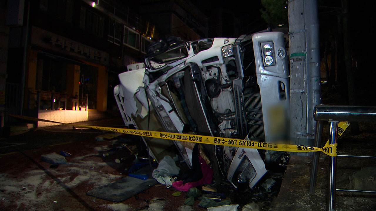 어젯(28일)밤 서울 금천구에서 4.5톤 냉동탑차가 경사로에서 미끄러져 전봇대와 차량들을 들이받고 전복됐습니다. 이 사고로 50대 냉동탑차 운전자가 현장에서 숨졌습니다.