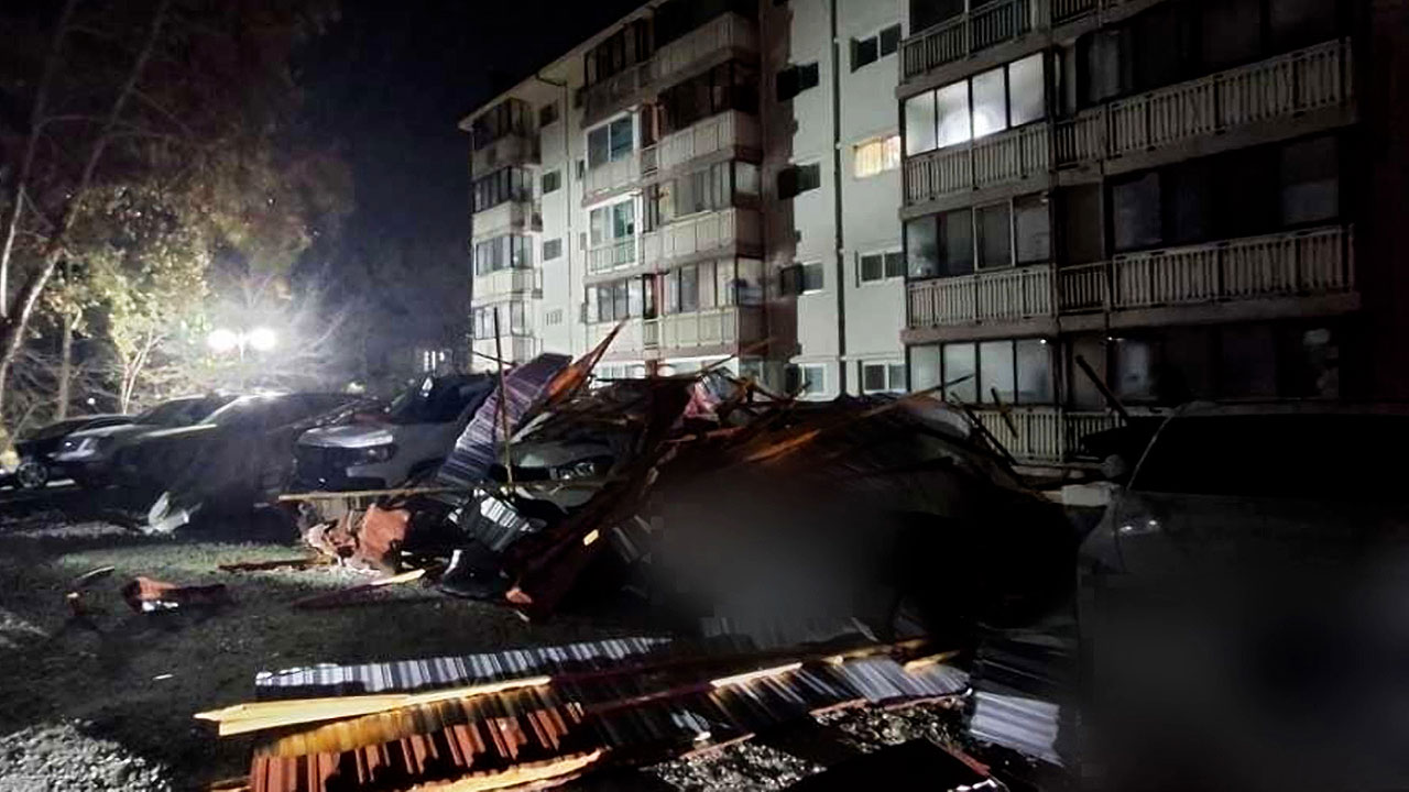 오늘 새벽 2시 47분쯤 속초시 교동의 한 아파트에서 지붕 철제 구조물이 강풍을 견디지 못하고 뜯겨져 나가 주차돼 있던 차량을 덮쳤습니다.
