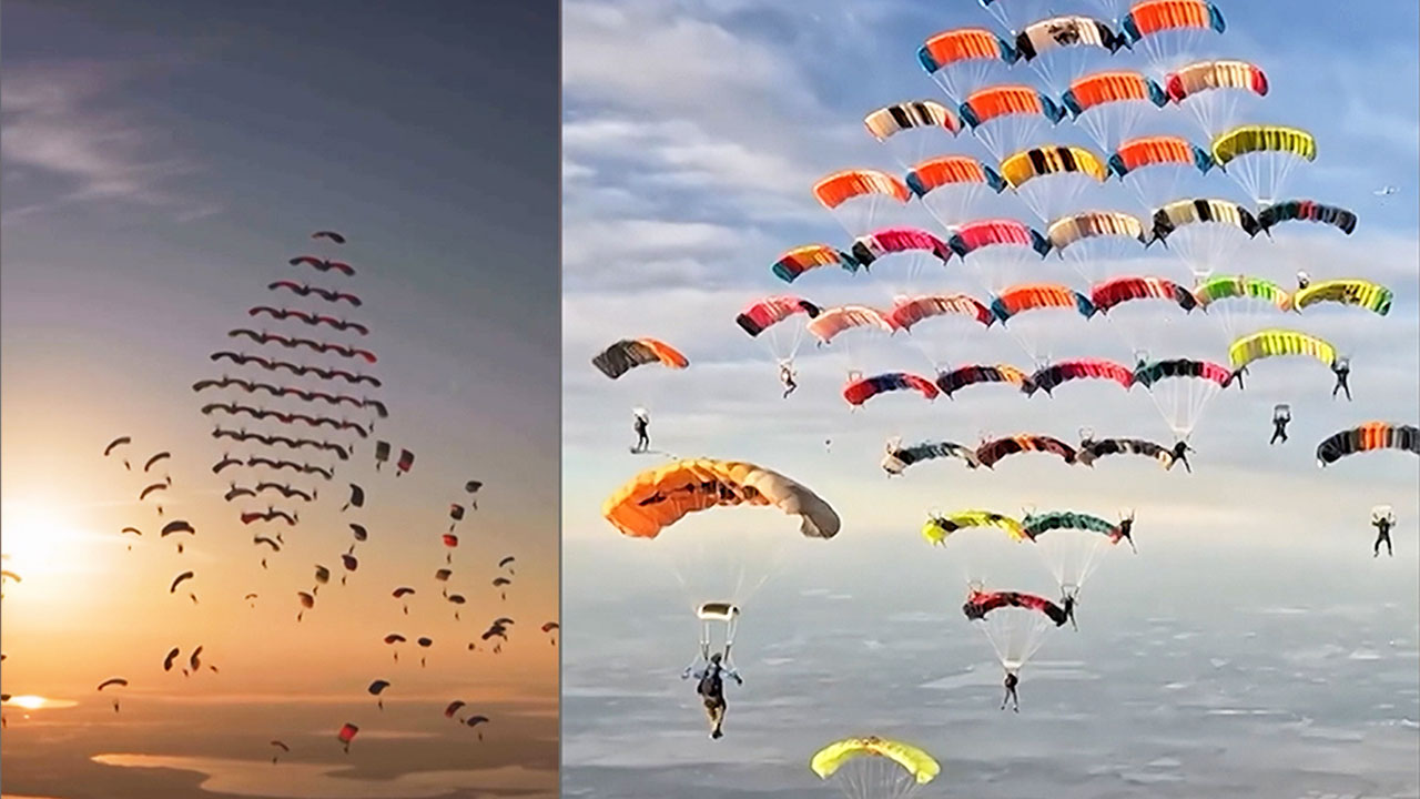 동료의 낙하산을 디딤판 삼고 층층이 쌓아 올리며 마름모 모양의 인간 탑을 완성해 내는데, 세계 20국에서 모인 110여 명의 스카이다이버들이 한 몸처럼 협동하는 모습이 경이로워 보일 정도입니다.