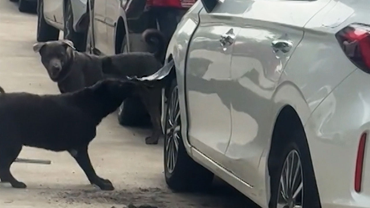 떠돌이 개 한 마리가 주차된 차량을 공격하고 있습니다.