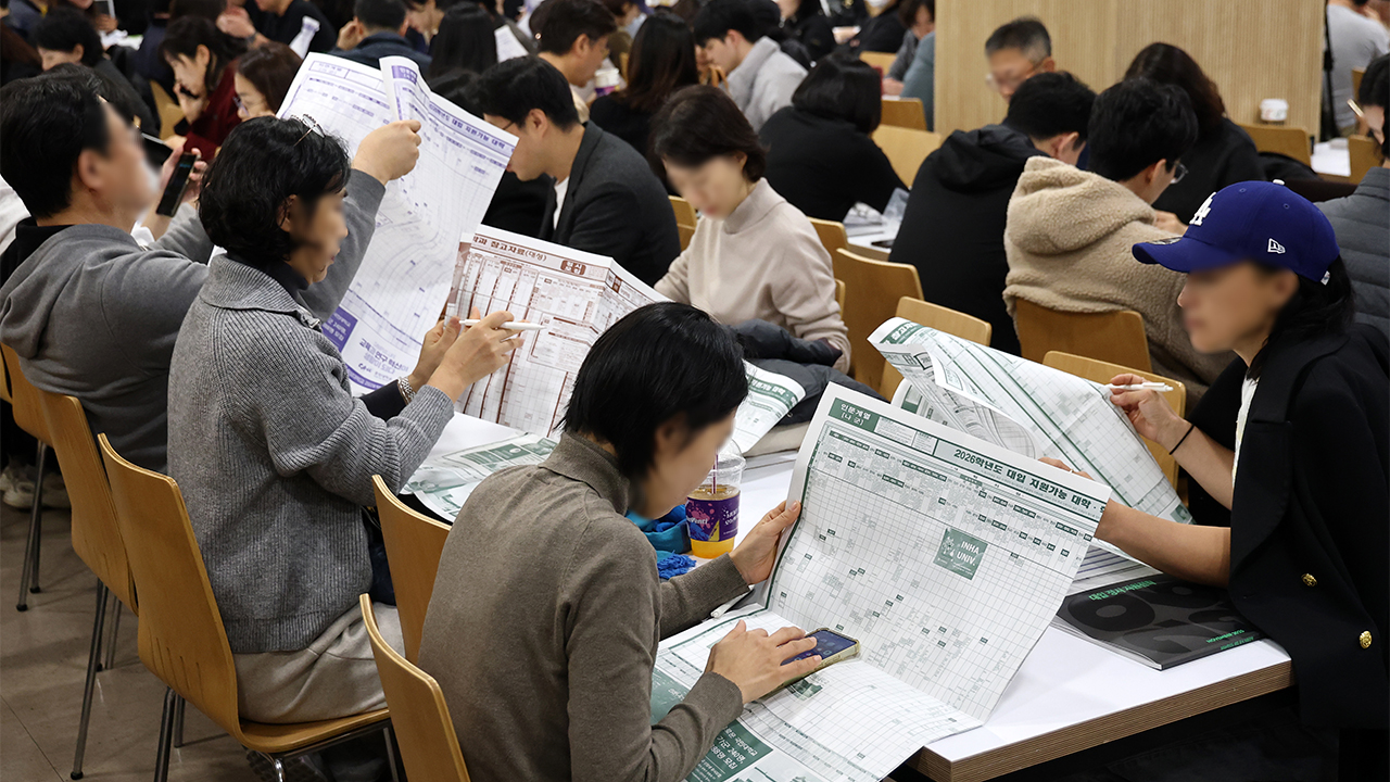 ▲ 지난달 16일 서울의 한 학원에서 열린 수능 가채점 설명회에서 학부모들이 대입 지원 관련 자료를 살피고 있다.