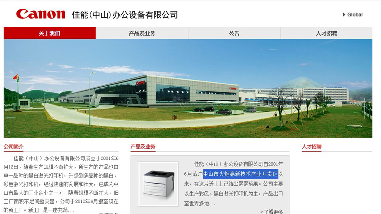 ▲ 중국 광둥성 중산의 캐논 프린터 공장 관련 홈페이지