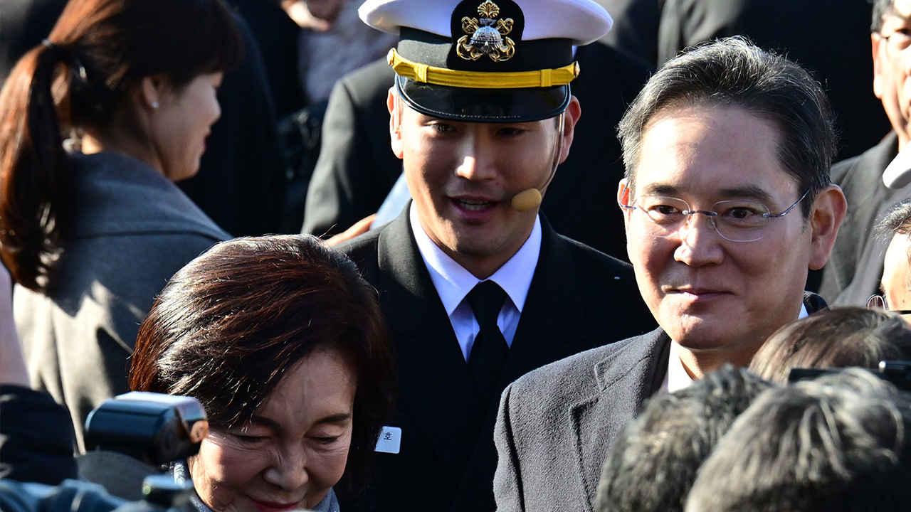 ▲ 28일 제139기 해군·해병대 사관후보생 수료 및 임관식에서 이재용 삼성전자 회장과 홍라희 리움미술관 명예관장이 이지호 신임 소위와 미소 짓고 있다.