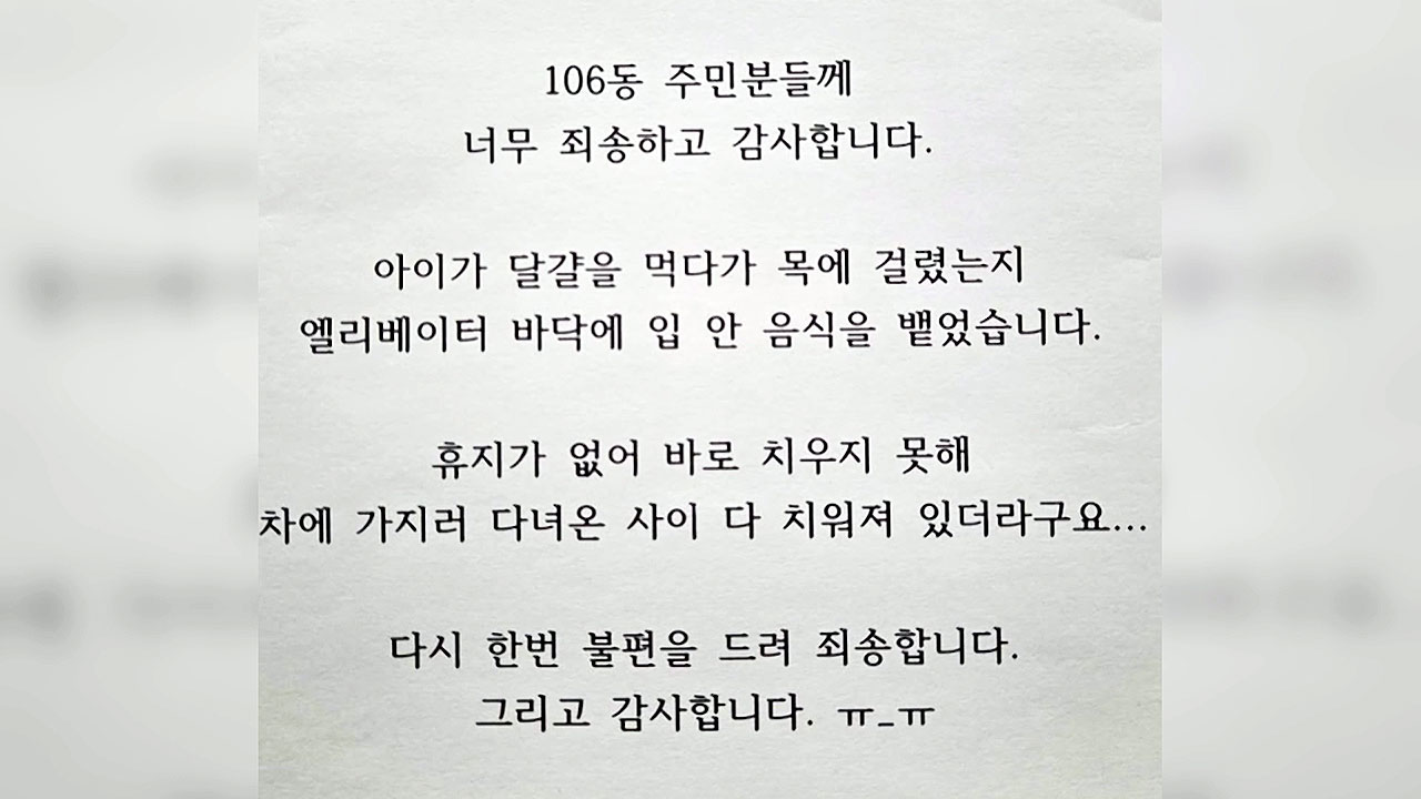 사연에 따르면 아이가 엘리베이터에서 달걀을 먹다 목에 걸려서 바닥에 음식물을 내뱉었고 휴지가 없어서 부모가 잠시 차에 다녀오는 사이에 누군가가 말없이 이를 모두 치워준 것입니다.