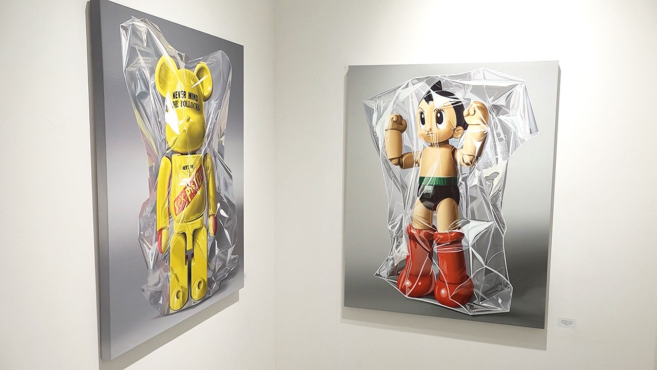 잘 알려져 있고 대중매체를 통해 친숙한 이미지를 강렬한 원색으로 되살리는 팝아트에 완벽한 재현을 추구하는 극사실주의 기법이 더해졌습니다.