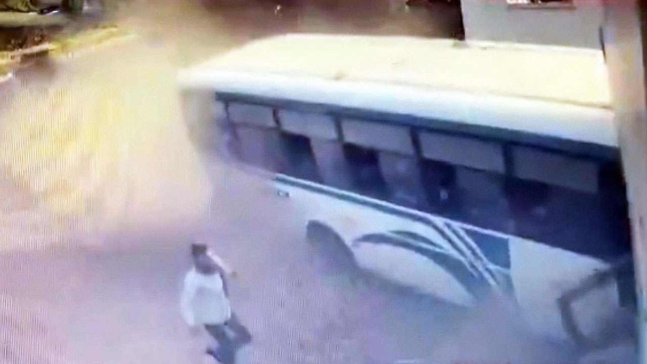 갑자기 버스 한 대가 방향을 틀더니 건물을 향해 돌진합니다.