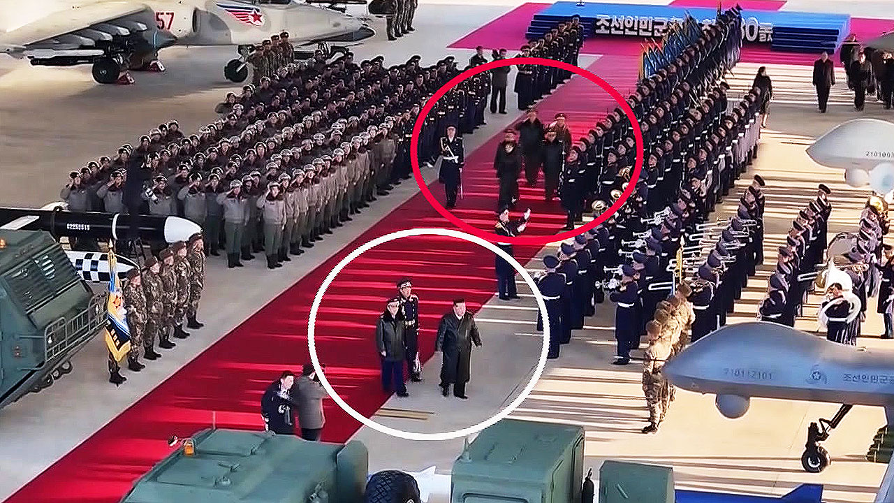 김정은이 공군 의장대 사열을 하는 동안 김주애는 사열대 옆쪽에 서 있었는데, 김정은이 이동을 하자 김주애도 이동을 하기 시작합니다.