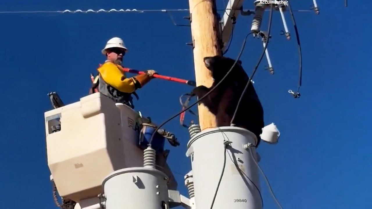 높은 전신주 위에서 곰 한 마리와 직원이 대치하고 있습니다.