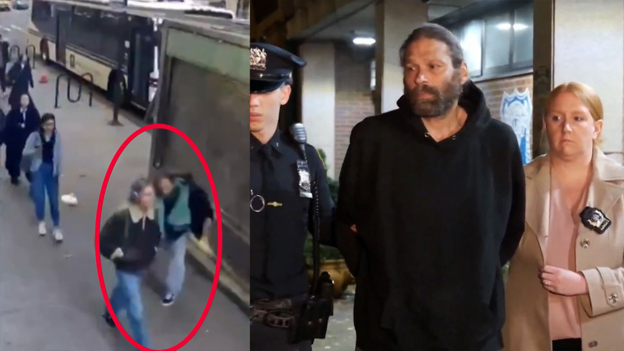 미국 뉴욕 로어맨해튼의 한 거리에서 남성이 갑자기 지나가던 여성을 때립니다.